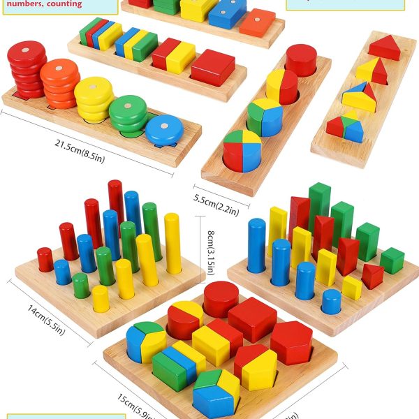 Wooden Geometric Shapes Stacking Rings and Fractions Boards 8 in 1 Set Puzzles- Shape Sorter Sorting Toy Stacking Game – Materials Educational Learning Toys for 3 4 5 6 Years