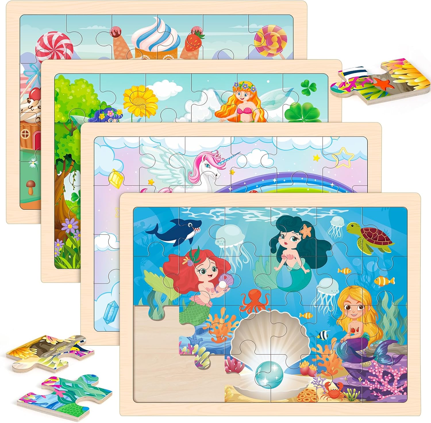 - Princess Toddler Puzzles – 4 pack 24pcs wooden engineering vehicle jigsaw puzzles for kids ages 3-5 years old. The wooden toys include human princess, mermaid princess, unicorn Princess, elf princess puzzles. Easy, funny, wonderful- educational Shape Puzzles toys, develop hand-eye coordination, fine motor skills, and creative thinking.