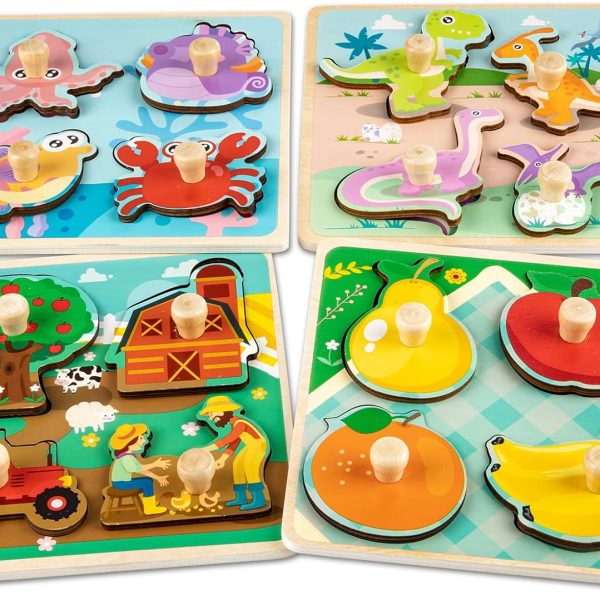 Wooden Toddler Puzzles – 4 Pcs Eco-Friendly Animal Patterns Jigsaw With Handles – Infant Kid Fine Motor Skill Learning Educational Toys for 1-3 Years Old