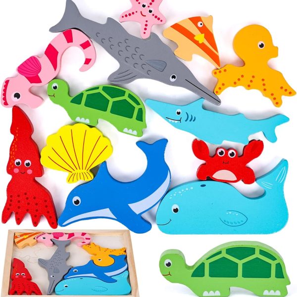 Wooden Sea Animal Stacking Puzzles, Chunky Jigsaw Toys for Kids, Educational Preschool Learning Toys, Toddler Birthday Gifts, 12 PCS